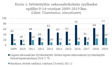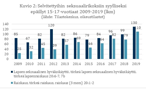 Lapsiasiavaltuutettu on Tilastokeskuksen oikeustilastojen pohjalta koonnut tiedot selvitet-tyihin seksuaalirikoksiin (lapsen seksuaalinen hyväksikäyttö; törkeä lapsen seksuaalinen hyväksikäyttö; törkeä lapsenraiskaus, sekä raiskaus ja törkeä raiskaus) syylliseksi epäiltyjen alaikäisten lukumäärät vuosina 2009–2019. Tarkastelu osoittaa, että vuosittain kymmenet alaikäiset ovat epäiltyinä syyllisyydestä lapseen kohdistuneeseen seksuaalirikokseen. Lapsi-asiavaltuutettu pitäisi tärkeänä näiden tapausten perinpohjaista selvittämistä siitä näkökul-masta, ovatko epäillyt tekijät itse ymmärtäneet tekonsa vakavuutta ja miten teot olisi voitu ehkäistä. Kriminalisointeja muutettaessa on huolehdittava siitä, että myös lapset ja nuoret itse ymmärtävät, mistä muutoksissa ja ylipäätään sääntelyssä on kyse. Tämä edellyttää sek-suaaliterveyskasvatuksen laadukasta opetusta kaikissa peruskouluissa.